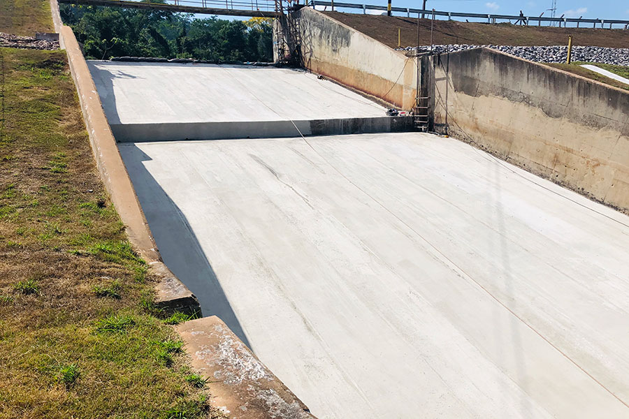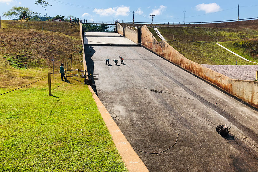 Para reduzir a permeabilidade do concreto e selar microfissuras, aplicou-se o PENESEAL PRO como primeira etapa do processo. Em seguida, o Patchline Pave entra em ação para realizar reparos localizados nas áreas danificadas. Por fim, para recuperar o perfil hidráulico do concreto no vertedouro, aplicou-se o Penetron CR-90 em espessuras que variam de 2 mm a 6 mm em toda a extensão da laje. Após quatro anos de aplicação, os produtos seguem apresentando desempenho excelente.